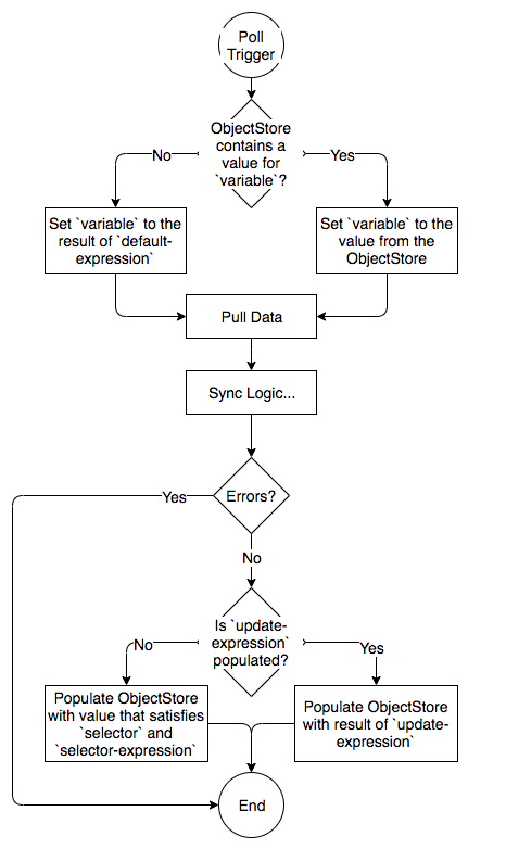 The variable attribute caused me a little confusion initially. The variable attribute is the name of the flowVar that will hold the watermark value over the course of the flow. When the poll triggers for the first time, variable is populated with whatever default-expression returns. variable is just the name of a flowVar, and can be accessed throughout the flow just like any other flowVar. After the first run, the watermark value is updated per the selector and selector-expression, or update-expression, whichever is defined. In this case, variable will be set with the biggest updatedTimestamp of all the records that were processed.